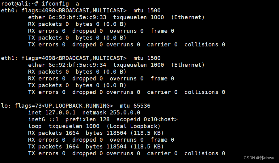 可能有人会疑惑,我就装了一块网卡,怎么有eth0和eth1两个,这个eth0和eth1的mac地址最后一位不同,它俩的作用就是可以外网和内网区分开,比如我用eth0配置外网,而eth1就可以选择配置内网。这是你所购买的网卡已经提供好的,二者可以相互不干扰。
