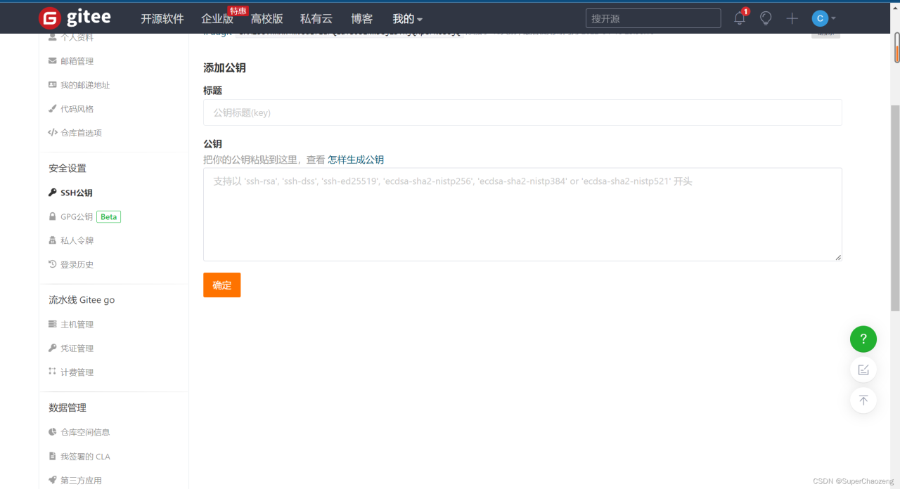 填好标题,将刚刚的公钥复制、粘贴到公钥下面的框框里面,之后点击“确定”即可。