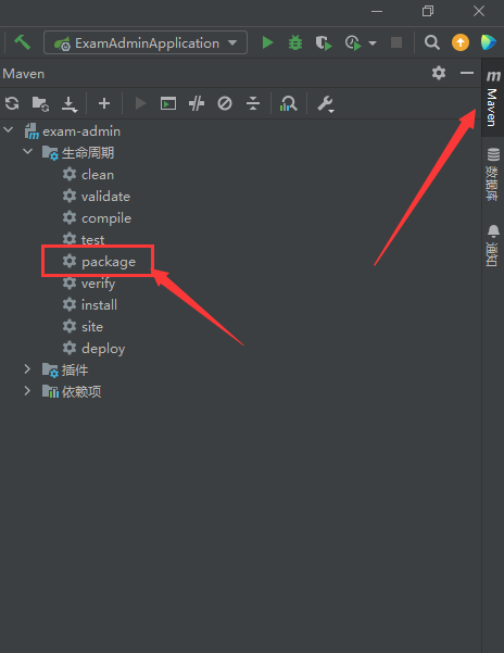 点击右侧的maven,如果右侧没有的话鼠标放在IDEA左下角进行添加,然后package;