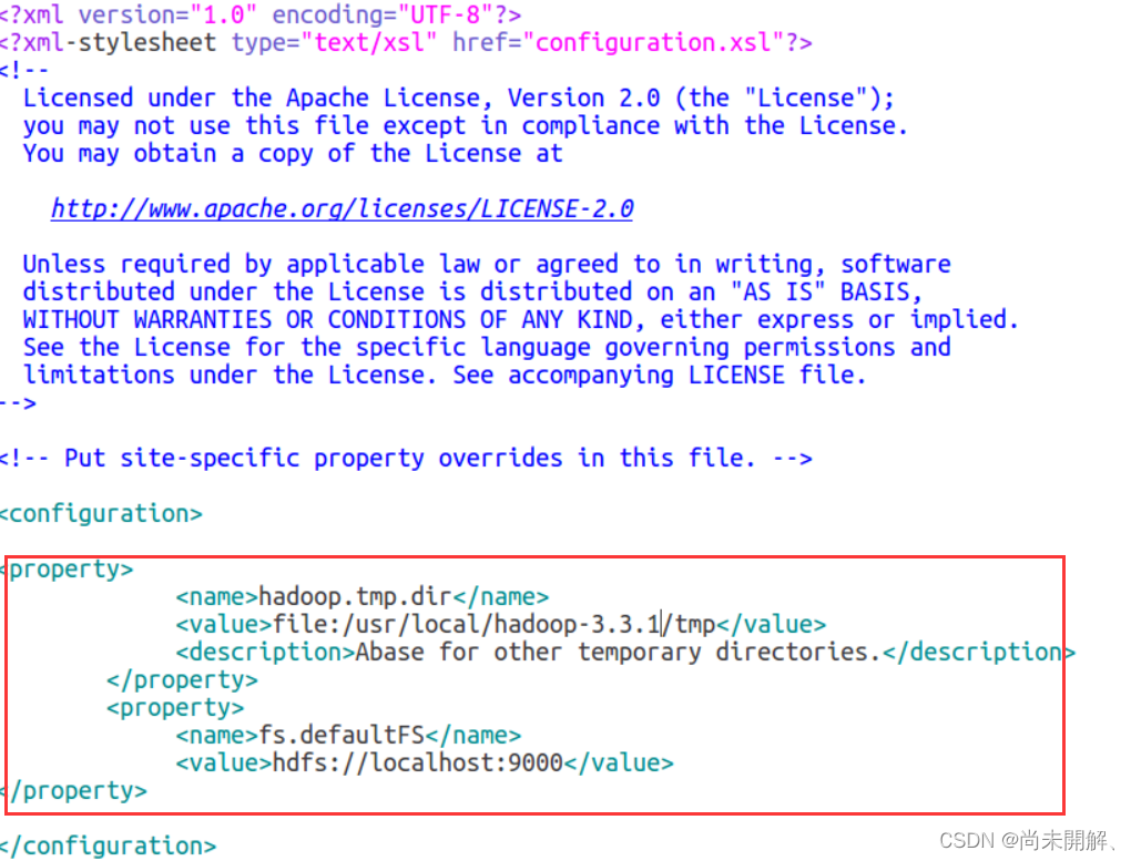 <property> <name>hadoop.tmp.dir</name> <value>file:/usr/local/hadoop-3.3.1/tmp</value> <description>Abase for other temporary directories.</description> </property> <property> <name>fs.defaultFS</name> <value>hdfs://localhost:9000</value> </property>
