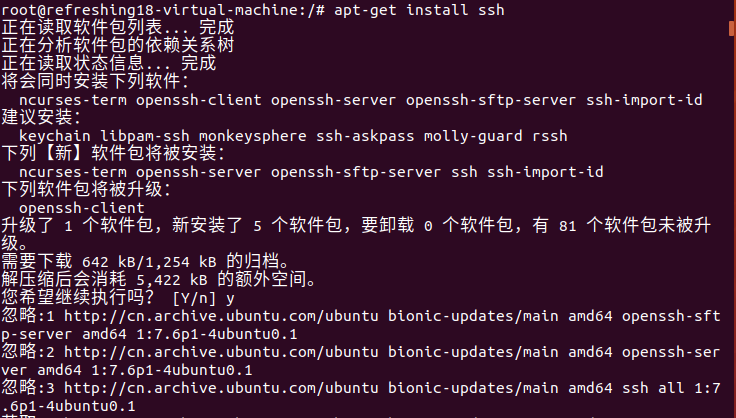 2,在 “终端窗口” 输入 sudo apt-get install openssh-server–> 回车 –> 输入 “y” –> 回车 –> 安装完成。
