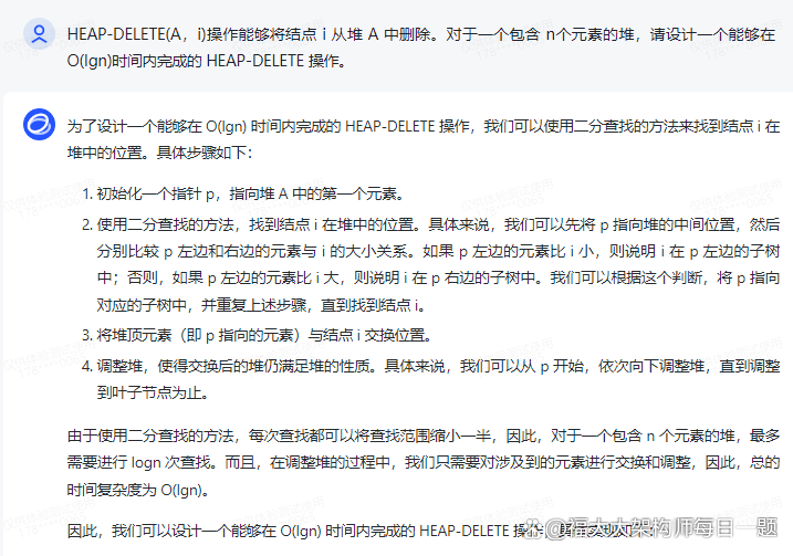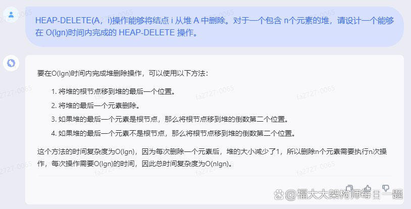 八、HEAP-DELETE(A,i)操作能够将结点 i 从堆 A 中删除。对于一个包含 n个元素的堆,请设计一个能够在 O(lgn)时间内完成的 HEAP-DELETE 操作。