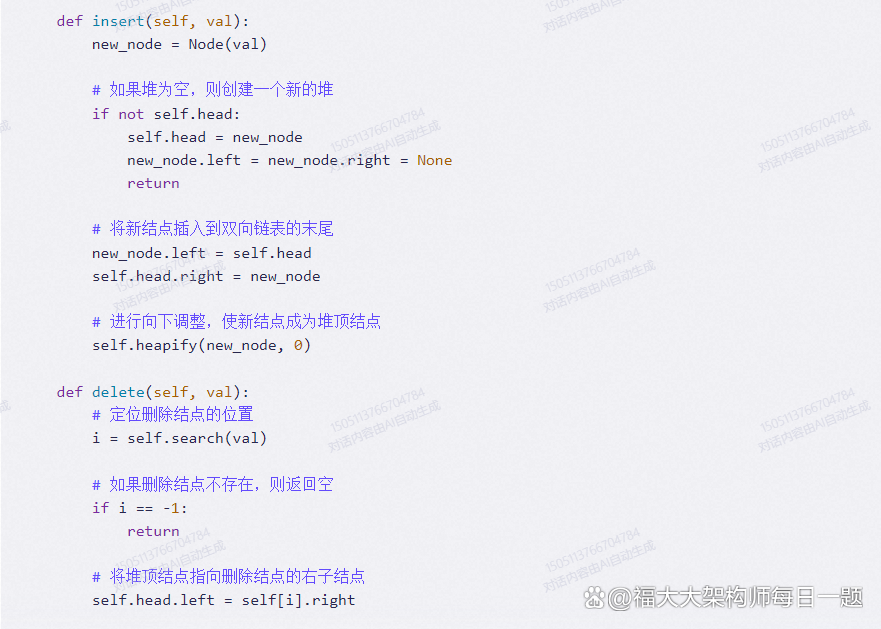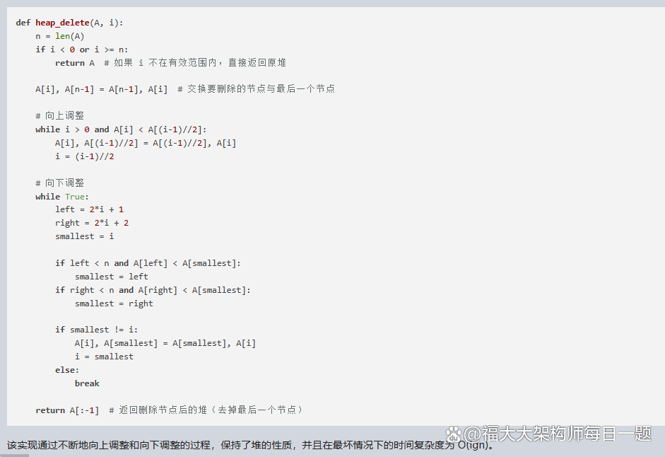 这个实现中,delete 方法就是 HEAP-DELETE(A,i) 操作。它首先检查要删除的结点 i 是否在堆中,然后删除该结点并重新调整堆的结构。