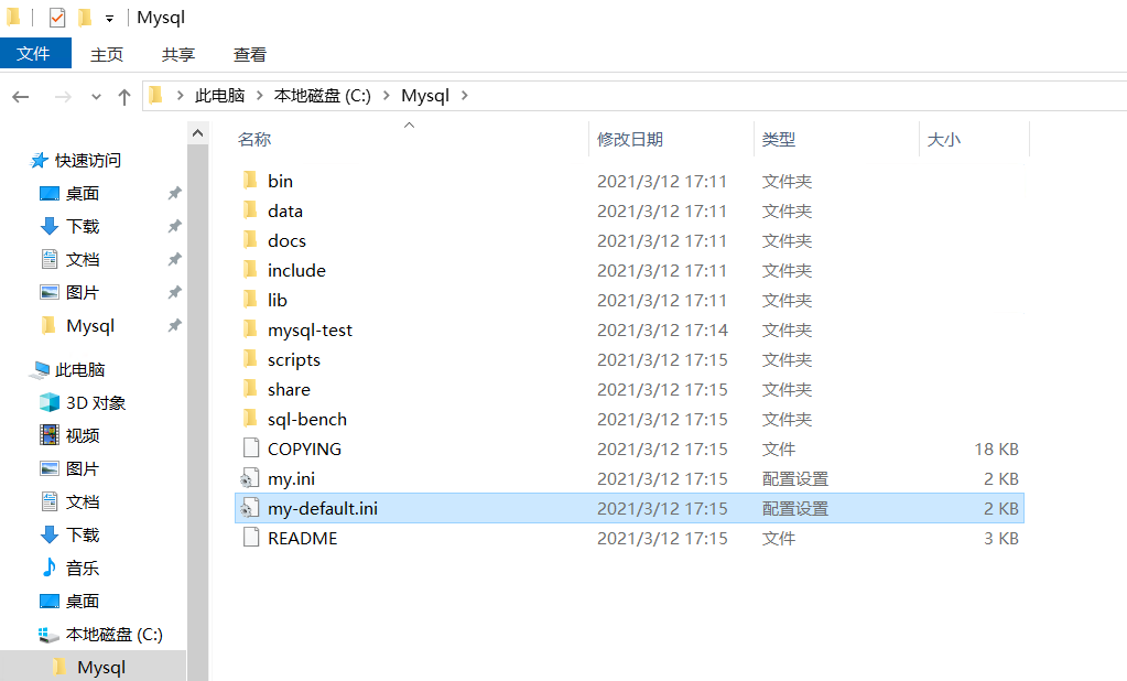 4. 回到mysql目录,复制一份my-default.ini,并且重命名为my.ini。