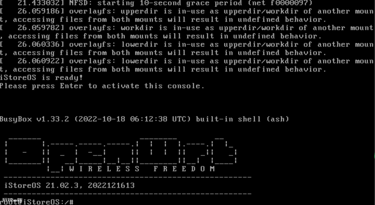 第十三步:配置OpenWrt系统导入完成之后开机,然后可以连接,进入一个新的网页终端,iStoreOS的系统比较大,启动较慢,可能需要等一等才能进入终端。
