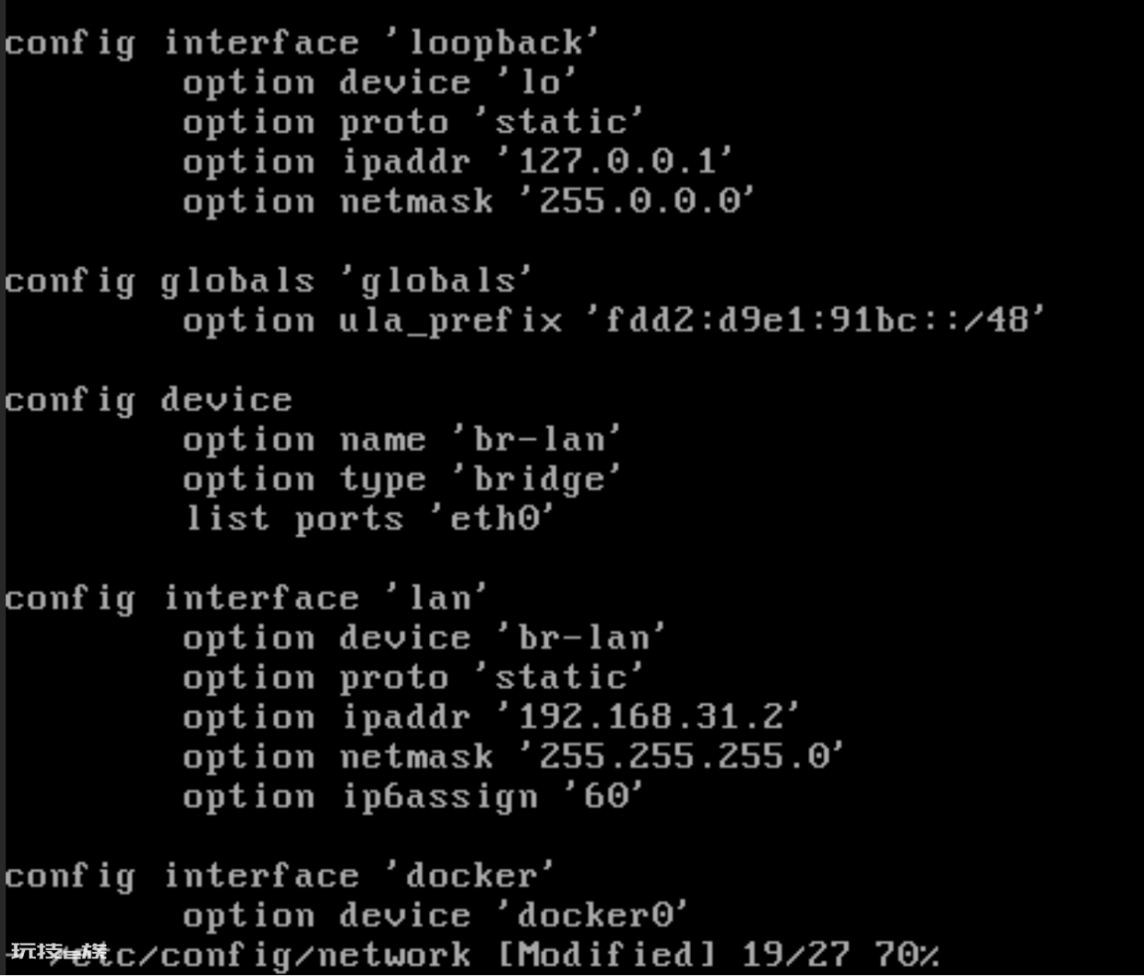 vim /etc/config/network按i键进入编辑模式,找到192.168.10.1或者192.168.5.1修改为192.168.31.2,然后Esc退出编辑模式,然后输入:wq保存(基本vim的操作)