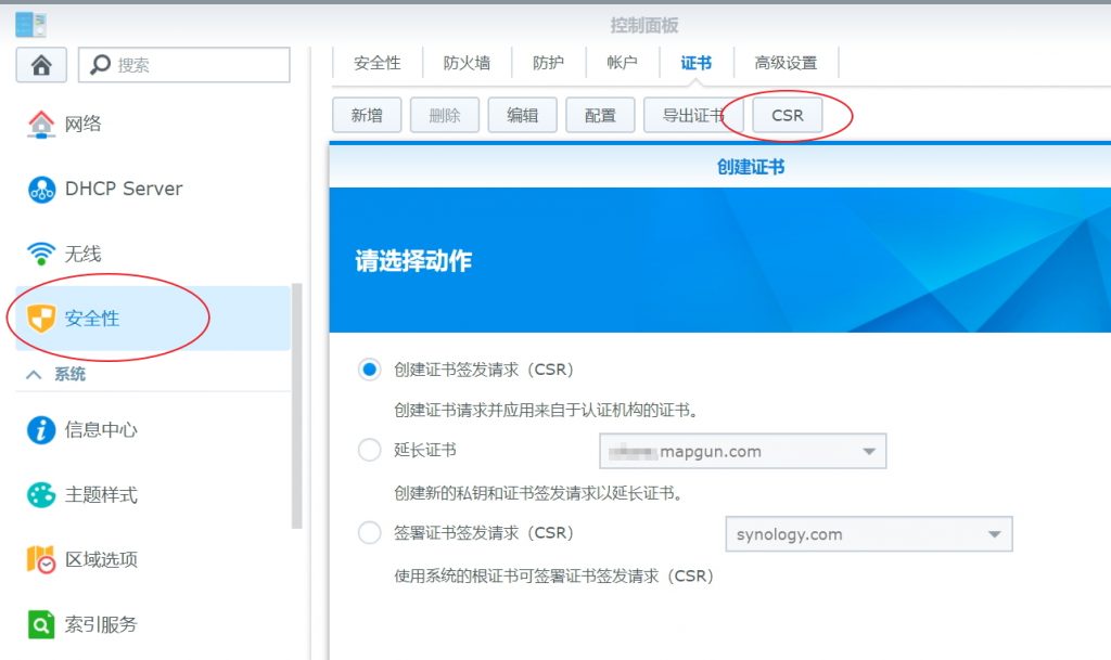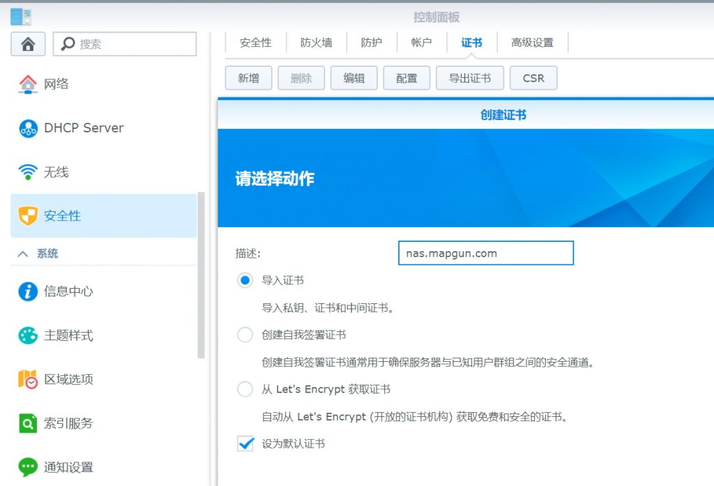 5、DSM中控制面板→安全性→证书→“新增”按钮,选择导入证书,勾选设为默认证书。