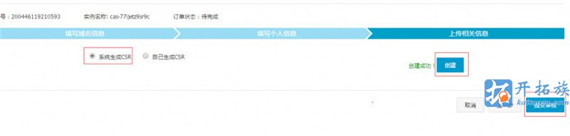 下一步,系统生成CSR,点击下创建,然后提交。(温馨提示:不用管他CSR是什么意思,按这个操作就行啦)