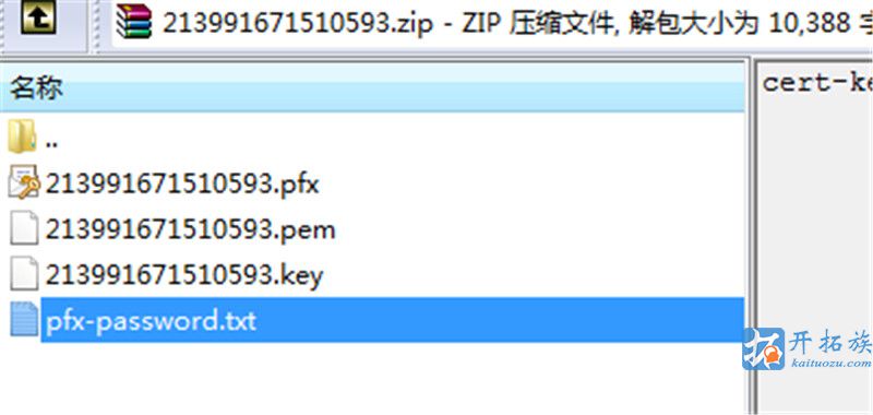 上面上传的证书文件,扩展名是.pfx,导入时需要输入一个密码,密码在下载的证书文件pfx-password.txt中查看