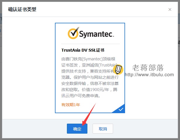 这里可以看到TrustAsia DV SSL证书的介绍情况,免费一年。申请就点击【确定】。填写需要申请免费SSL证书的域名