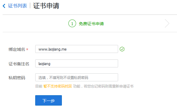 主要是域名填写,只支持”www.laojiang.me”这样类型的,不可以直接输入”laojiang.me”不带前缀的。然后我们需要验证域名所有权。
