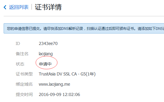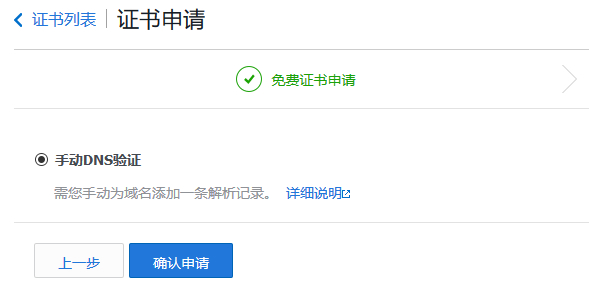 这里我选择手动DNS验证,我们需要根据【详细说明】介绍提交一个别名解析。或者我们先点击【确认申请】,然后再看到需要添加别名解析的记录。