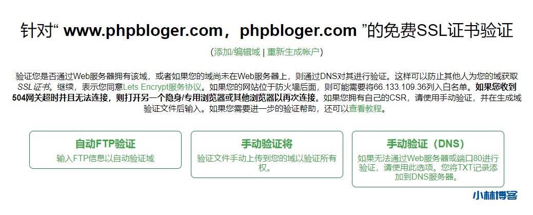 - 首先在首页地址栏输入你将要加https的网站地址:比如:phpbloger.com,创建免费的ssl证书,创建之后有3种认证方式,自己选择其中之一,我选得手动认证。