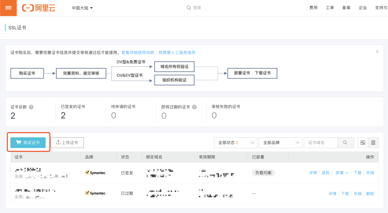 进入控制台后点击购买证书进入对应的购买界面,如下图: