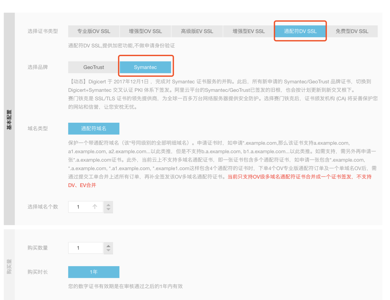 博主这里购买的是通配符DV型的(毕竟资金有限。插一句,阿里云有免费的SSL证书可以购买,不过考虑到稳定性还是花点钱来的踏实,当然免费的用还是一样可以用,具体的还是需要根据自己的需求来购买。购买有风险,花钱需谨慎。),如下图: