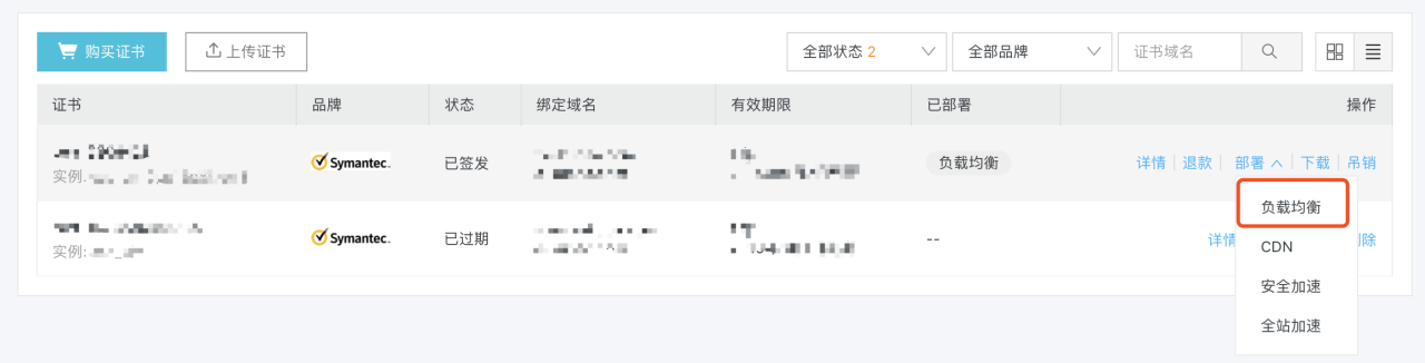 这里博主是直接在阿里云的负载均衡上部署的,在对应的证书后面点击部署,选中负载均衡,如下图: