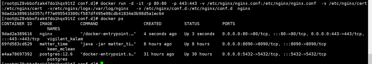 docker run -d -it -p 80:80 -p 443:443 -v /etc/nginx/nginx.conf:/etc/nginx/nginx.conf -v /etc/nginx/cert:/etc/nginx/cert -v/etc/nginx/logs:/var/log/nginx -v /etc/nginx/conf.d:/etc/nginx/conf.d nginx