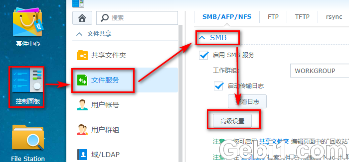 方法为【控制面板】——【文件服务】——【smb】——【高级设置】——【最小SMB协议】