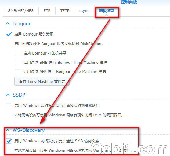 方法为【控制面板】——【文件服务】——【高级设置】——【WS-Discovery】启用Windows网络发现。
