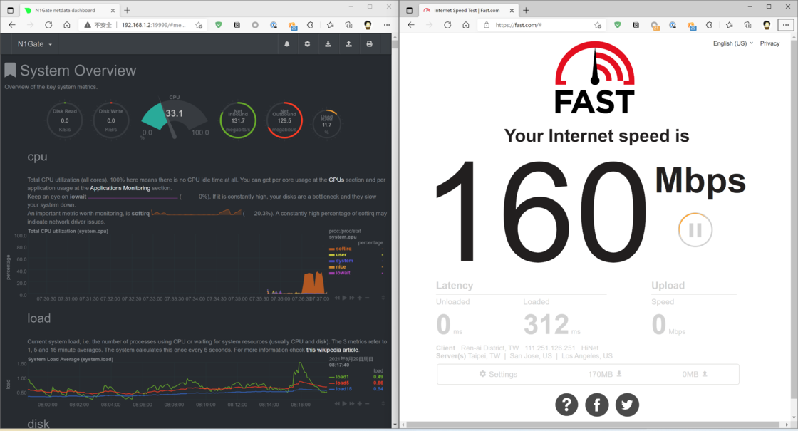 我在另一台电脑上不停地iperf3占满N1的网络带宽,同时在旁路网关的客户端电脑上测速。