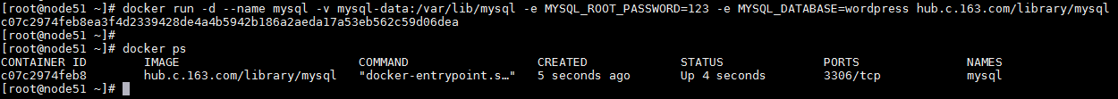 docker run -d –name mysql -p3306:3306 -v mysql:/var/lib/mysql -e MYSQL_ROOT_PASSWORD=123 -e MYSQL_DATABASE=wordpress hub.c.163.com/library/mysql