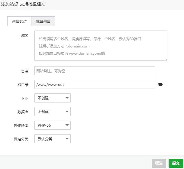 【网站】>【添加网点】。添加的时候可以不创建ftp和数据库,如果创建的话会得到对应的密码,需要保存。