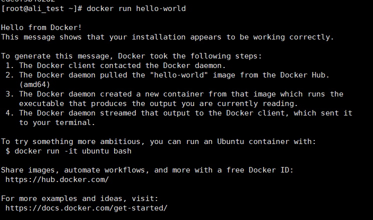 上面的一系列操作就已经将docker安装好了,接下来我们就需要测试一下自己有没有安装好,运行一个hello-world。