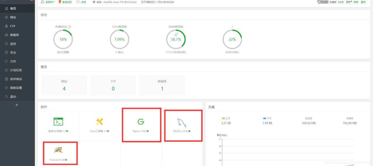 在宝塔里面安装:Nginx、Tomcat、MySQL、(phpMyAdmin、PHP)。Nginx是做基础支持的。安装Tomcat后,会自动帮我们安装好JDK,但是Tomcat建议安装Tomcat 8,Tomcat 8对应JDK 1.8,Tomcat 7对应JDK 9,我们开发大多用JDK1.8。MySQL是提供数据库支持。phpMyAdmin是一款数据库管理软件,它必须有PHP环境支持,所以要用必须装PHP,建议在PC装的Navicat,可以直接连接云数据库。