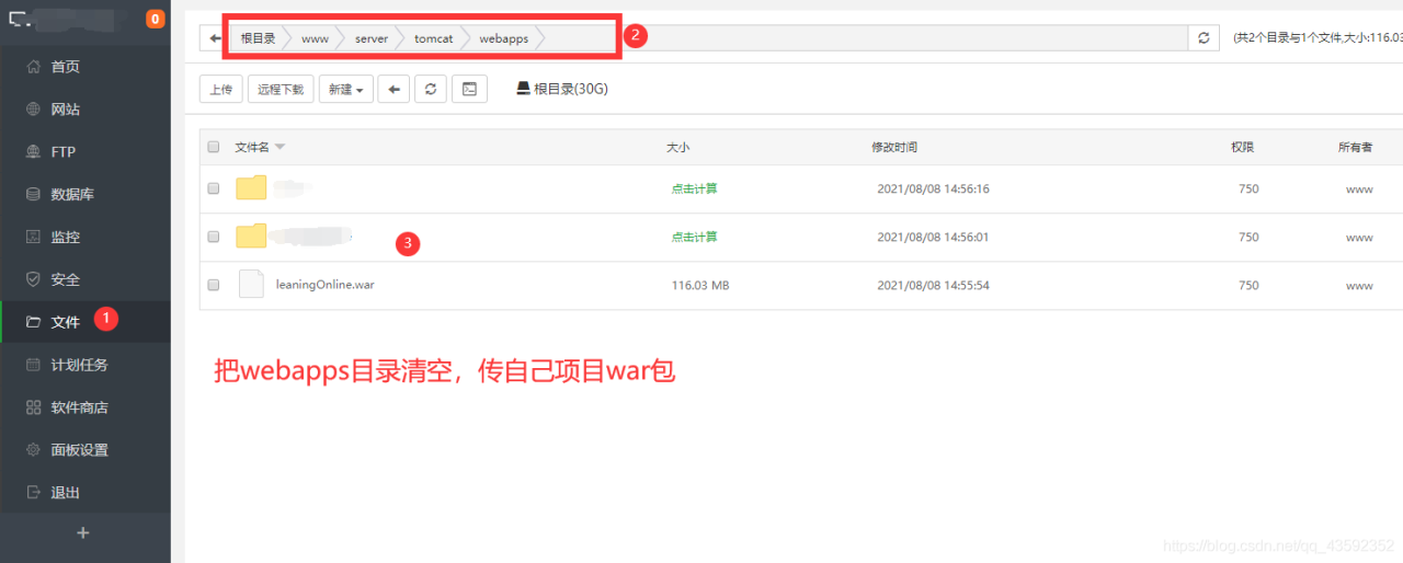 找到tomcat的目录:/www/server/tomcat/webapps。清空webapps里面的所有内容,把自己的war包上传到此文件夹里面,不需要解压。(假设你的war包叫做example.war)