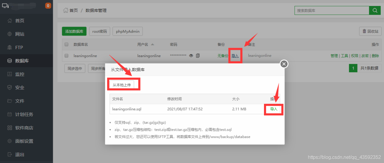 在宝塔面板中添加数据库,然后导入你本地导出的sql文件。