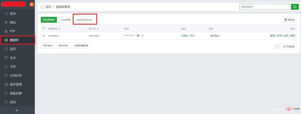 先添加数据库,命名与自己的数据库名相同,添加成功后点击phpMyadmin进行管理,大多数情况会打不开phpMyadmin,这里就出现了宝塔的一个坑,解决方法如下: