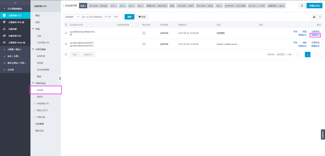 进入控制台-安全组-选择你ECS实例使用的安全组策略并配置规则
