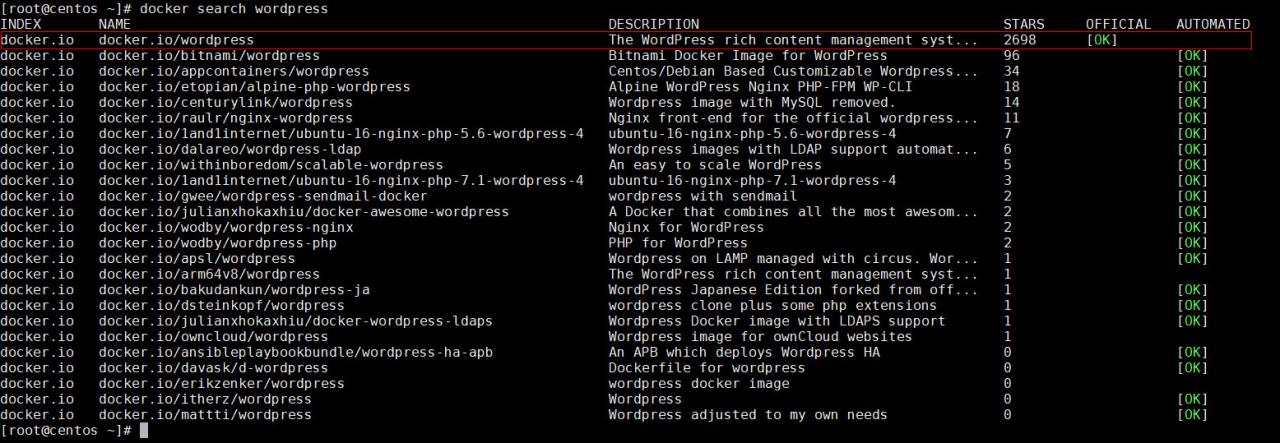 #搜索wordpress镜像 docker search wordpress #下载wordpress镜像到本地 docker pull wordpress