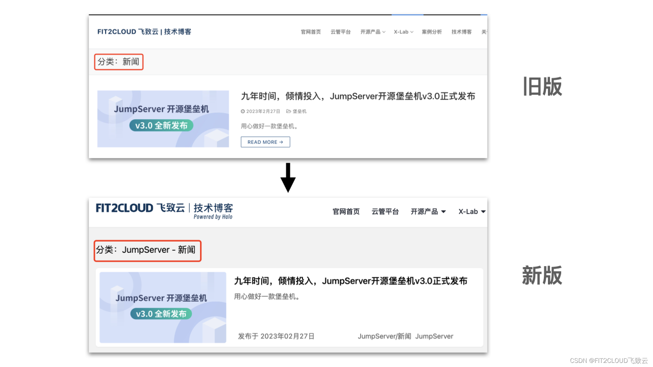 2023年3月23日,中国领先的开源软件公司FIT2CLOUD飞致云宣布,正式将原有基于WordPress构建的技术博客站点迁移至基于开源建站工具Halo构建的新站点(https://blog.fit2cloud.com)。