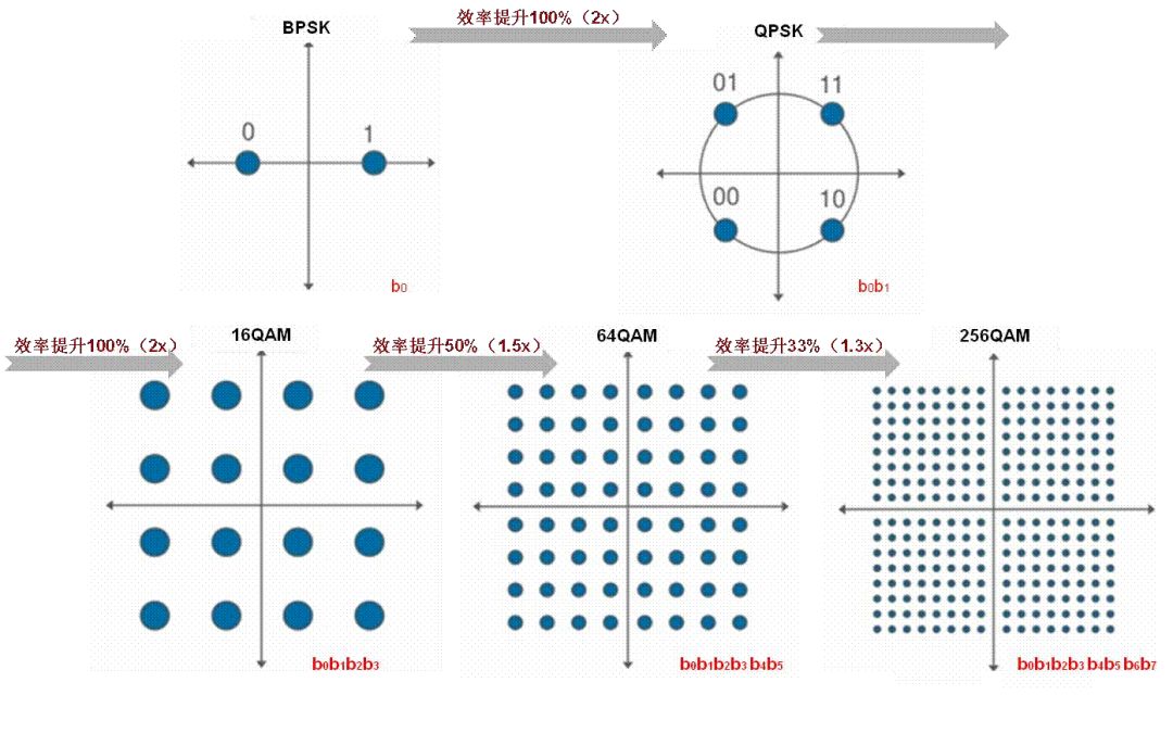 常用的调制方式包括BPSK、QPSK、16QAM,64QAM和256QAM,能同时发送的比特数为1个,2个,4个,6个和8个。Wi-Fi 6可以支持1024QAM,可同时发送10个比特的数据,速率自然大为提升。
