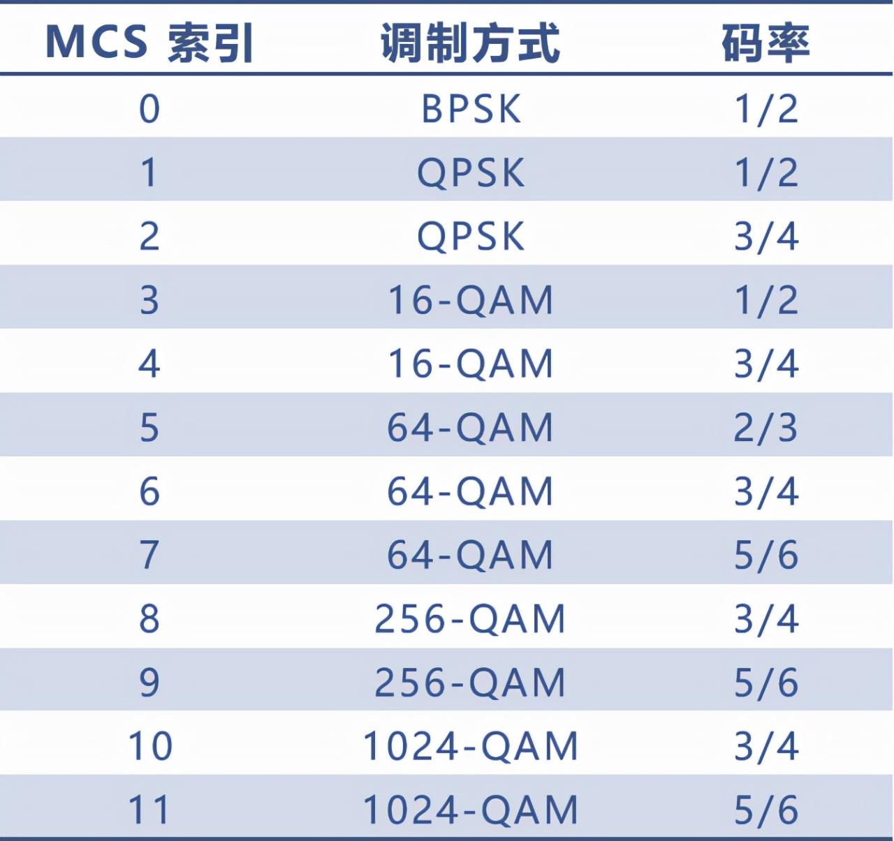 不同的调制方式,加上不同的码率,就组成了调制编码策略(MCS)。下表是Wi-Fi 6中的MCS表,可以看出最高阶MCS为11,对应于1024QAM加5/6的码率。