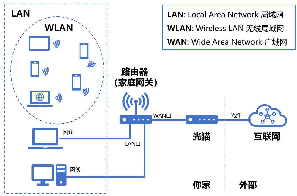 我们前面说到的局域网,也被称为内网,在路由器上用LAN(Local Area Network)来表示,因此Wi-Fi信号也被称作WLAN(Wireless LAN,无线局域网);而我们要访问的互联网,也被称作外网,在路由器上用WAN(Wide Area Network)来表示。