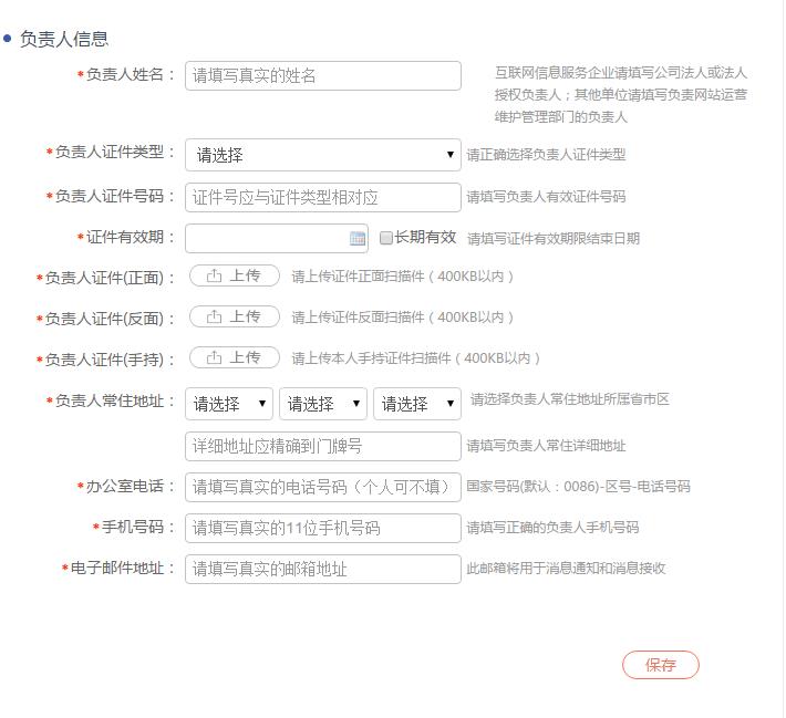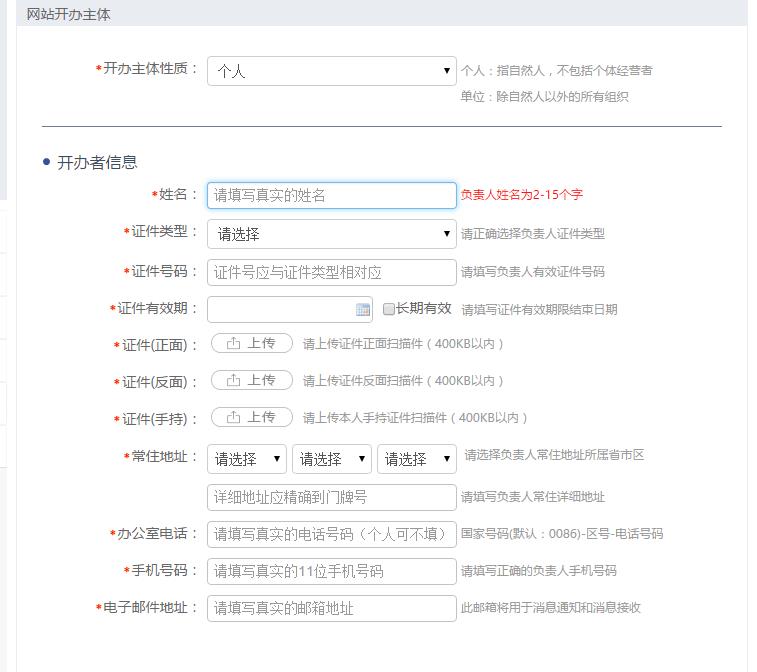 后注册一个帐号,注册后账号密码登录进去就可以添加网站负责人主体,备案资料包括:营业执照、身份证信息及正反面照片,手持身份证的照片 手机号码、邮箱