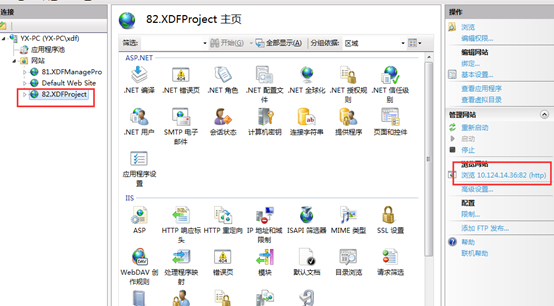 11. 点击确定,保存配置,回到IIS主页面查看我们已配置好的网站已经存在了,从右侧点击浏览网站,即打开了我们对应项目的初始页面。
