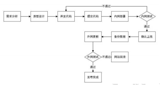 在运维过程中,网站部署是运维的工作之一。传统的网站部署的流程大致分为:需求分析 –> 原型设计 –> 开发代码 –> 提交代码 –> 内网部署 –> 内网测试 –> 确认上线 –> 备份数据 –> 外网更新 –> 外网测试 –> 发布完成。如果在内网测试时发现代码有异常,返回代码开发人员名字,调整代码;如果在外网测试时发现外网部署的代码有异常,可以及时进行网站回滚。