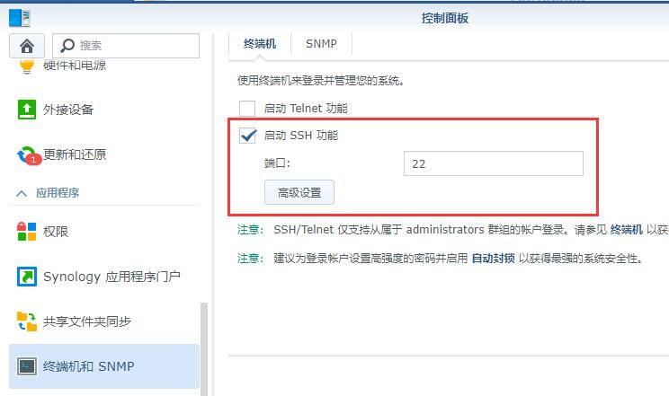 首先在DSM的控制面板里启用终端机的SSH连接。