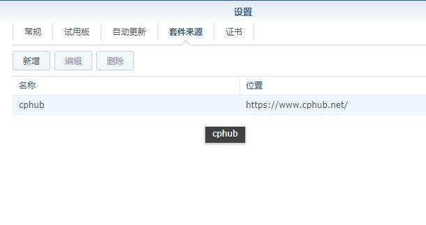 然后点击套件中心上方的设置,在套件来源里添加https://www.cphub.net/,添加后套件中心左侧栏最下方会多出社群选项卡。