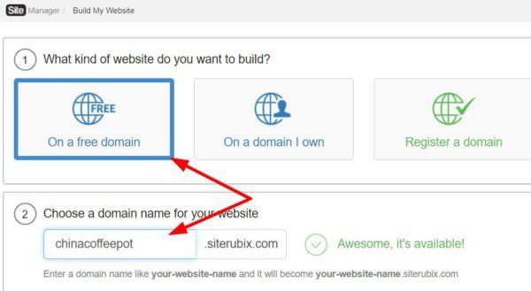 选择On a free domain并在下面输入你的子域名。如果你是一个咖啡壶的外贸经销商,选择chinacoffeepot作为网站的子域名,显示available,说明该子域名还未被注册: