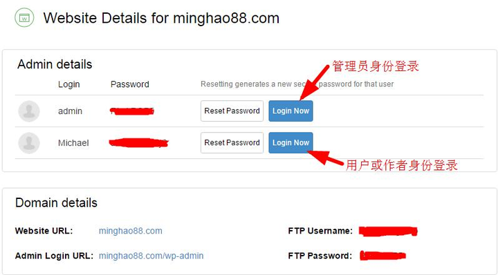 网站建好后,可以在site manager 里面查看你已经建好网站的细节,登陆密码等,见下图: