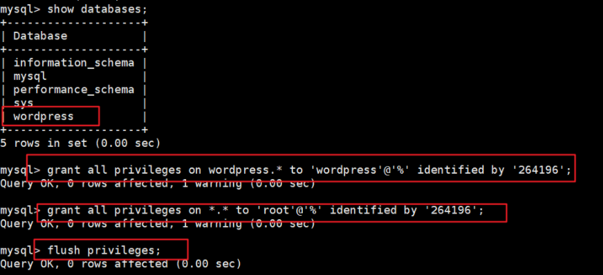 docker exec -it mysql /bin/bash mysql create database wordpress; grant all privileges on wordpress.* to 'wordpress'@'%' identified by '264196'; grant all privileges on *.* to 'root'@'%' identified by '264196'; flush privileges;