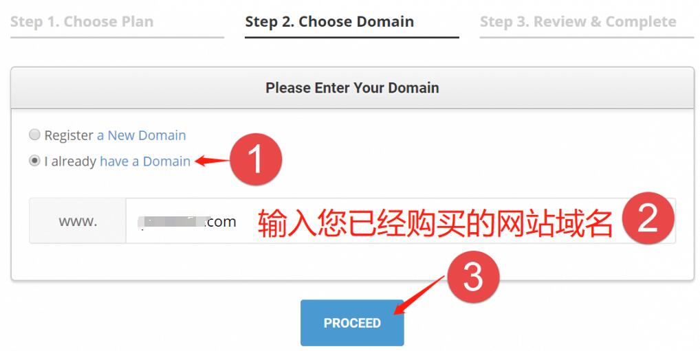 在下图中,选择第二项【I already have a Domain】,输入您已申请好的网站域名,然后点击【Proceed】。