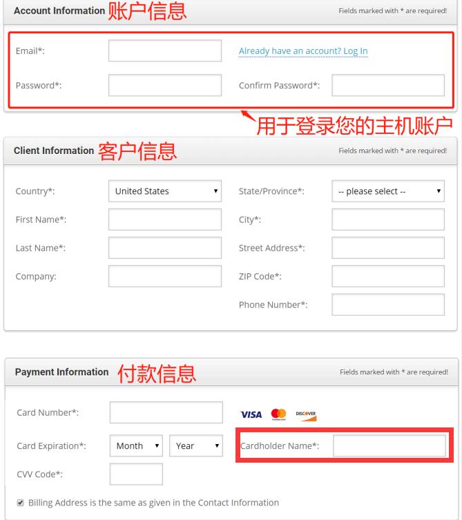 付款信息 (Payment Information):信用卡卡号,CVV,过期年月,持有人姓名的拼音(非大陆的朋友请用英文名)