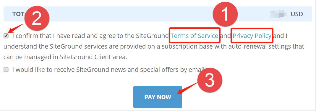 首先阅读【Terms of Service】和 【Privacy Policy】,如果您同意,请点击下图中的(2)处,最后点击【Pay Now】完成付款。