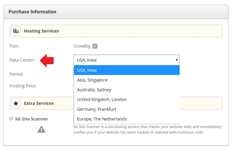 选择主机数据中心的地址:新加坡、澳大利亚、美国、欧洲、德国、英国。