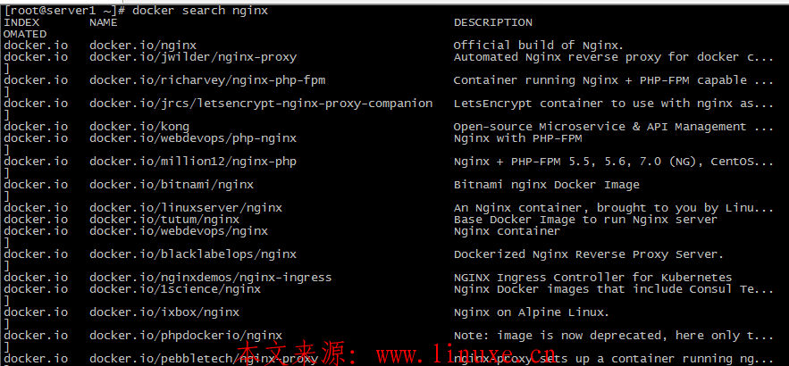 docker search nginx # INDEX代表了镜像来源于哪个仓库,默认是docker.io # NAMES:镜像的名字,如果名字没有用/分割代表是顶级仓库,通常是官方提供的镜像。而带/的前面是用户名,后面才是镜像名,后续安装和启动都需要用到这个名字 # DESCRIPTION:镜像的描述信息 # STARS:是获得的星数,也就是评分或热门程度 # OFFICIAL:官方认证